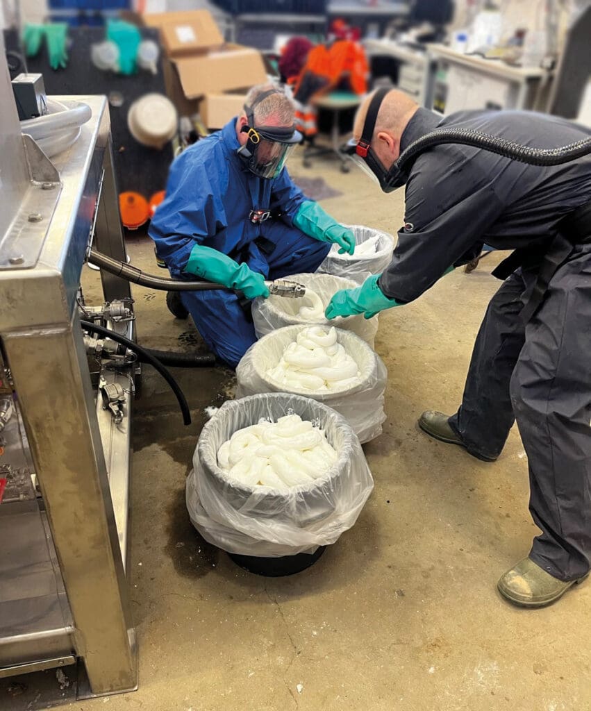 For øyeblikket utfører vi testkjøringer med hydrogenperoksidemulsjon ved hjelp av en produksjonsmodul for lokal fremstilling. Emulsjonen produseres direkte på bruksstedet, ettersom risikoene ved transport og lagring av hydrogenperoksid ikke er tilstrekkelig kartlagt. Hydrogenperoksidemulsjonen har ikke fått et eget UN-nummer, og derfor mangler testmetoder og krav basert på risikovurdering. Ved fullskala transport og lagring håndteres store mengder stoff, noe som kan ha alvorlige konsekvenser ved ulykker. I tråd med ansvarlig praksis kan produksjonsvolumet økes i takt med at risikoene blir bedre kjent og håndterbare.