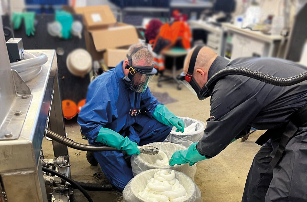 I testingen av produksjonsmodulen har det vært et stort fokus på arbeidssikkerhet. Målinger har vist at håndtering av hydrogenperoksidløsning og emulsjon gir høye konsentrasjoner av hydrogenperoksid i luften rundt arbeidsområdet. Grenseverdien for 8 timers eksponering er 1 ppm., og for 15 minutters eksponering 2 ppm. I våre tester har vi målt konsentrasjoner på 2–20 ppm. Med tanke på hydrogenperoksidets kjemiske aggressivitet har vi valgt en beskyttelsesløsning som krever en ny arbeidskultur.