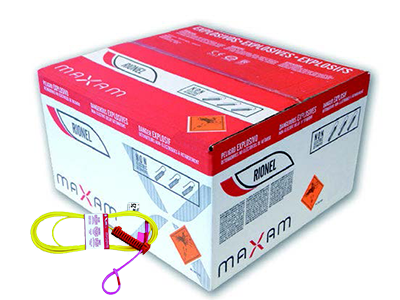 The RIONEL F BC (Bunch Connector) is specifically designed for the simultaneous initiation of multiple (or bunch of) non electric shocktube detonators. These connectors are made up of a length of shocktube connected to a colour coded connector block containing a mini-detonator that holds a base explosive charge. The RIONEL F BC is designed to initiate a factory assembled loop of detonating cord which in turn can hold and initiate up to 20 non-electric shocktube leads. The detonator is intentionally designed to initiate the attached 0.6 meter of 6 gram/meter detonating cord, reducing the risk of shrapnel,cut off of the fast ened shocktube detonator leads. RIONEL F BC are available in standard 4.8–6–12–30 meter length.